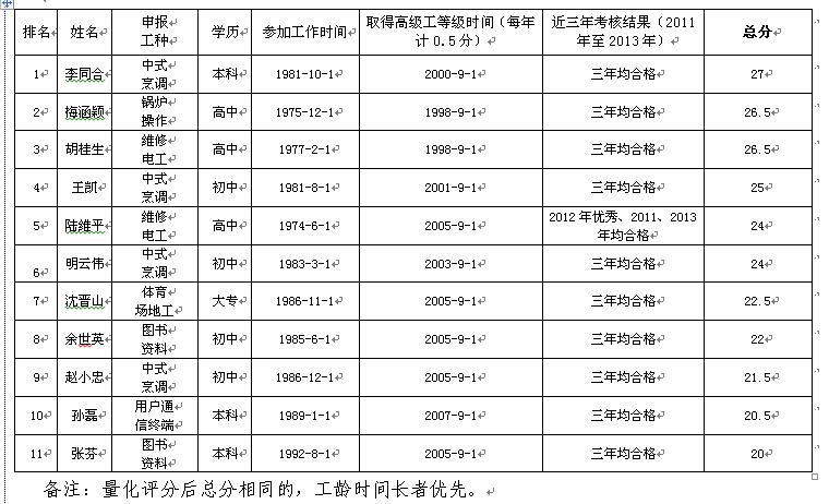 根据江西省人社厅《关于开展全省机关事业单位工勤人员岗位等级考核工作的通知》(赣人社发〔2014〕453号)和九江市人社局及学校有关文件精神,学校开展了工勤人员岗位等级考核申报工作。经九江市人社局核定,本次工勤人员岗位等级考核学校有2名技师职数,组织人事部按照《Ky开元集团岗位设置实施暂行方案》(九院字[2014]48号)中《Ky开元集团专业技术和工勤技能岗位竞聘量化评分细则》有关规定,组织了相关部门对申报技师人员进行了资格审查和量化评分。依据量化评分情况,学校将从高分到低分等额推荐申报,现将符合申报技师条件人员的量化评分结果公示如下: