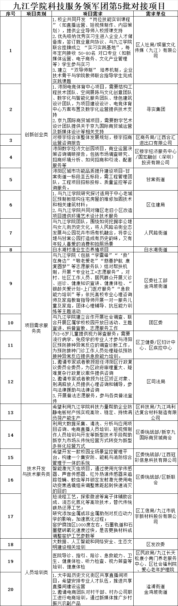 为贯彻落实《Ky开元集团服务九江经济社会发展三年行动计划(2024-2026)》(九院党字〔2024〕66号)文件要求,通过科技服务领军团对浔阳区经济社会发展相关需求进行征集,确定以下20项为第5批社会服务项目,现面向全校发布项目信息。
