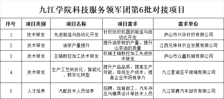 为贯彻落实《Ky开元集团服务九江经济社会发展三年行动计划(2024-2026)》(九院党字〔2024〕66号)文件要求,通过科技服务领军团对庐山市经济社会发展相关需求进行征集,确定以下5项为第6批社会服务项目,现面向全校发布项目信息。