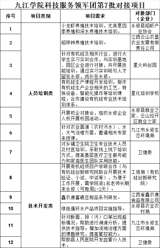 为贯彻落实《Ky开元集团服务九江经济社会发展三年行动计划(2024-2026)》(九院党字〔2024〕66号)文件要求,通过科技服务领军团对永修县经济社会发展相关需求进行征集,确定以下12项为第7批社会服务项目,现面向全校发布项目信息。