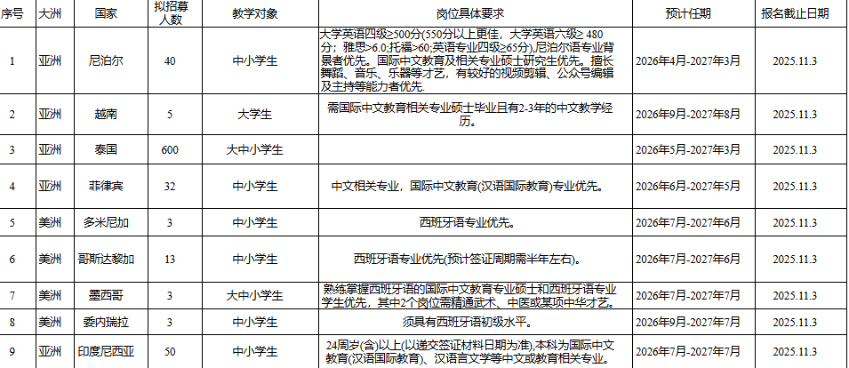 面向全国各类学校招募国际中文教育志愿者,根据岗位要求的赴任时间和签证进度,不同国别志愿者岗位分批截止报名。岗位信息、报名时间及报名条件详见附件岗位信息表。