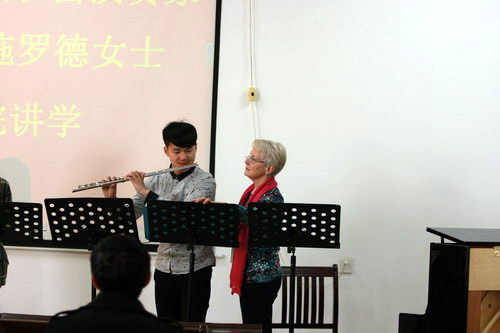 上课过程中,师生们热情高涨,艺术学院部分学生演奏了《卡门幻想曲》等独奏曲和《D大调游戏曲》等重奏曲。演奏完,施罗德女士提出了详细的指导意见。随后,施罗德女士拿出了一份自备的曲目,让同学们进行试奏,演奏的同时,给予了很多细节上的指导。师生们纷纷向施罗德女士提出长笛学习中遇到的难题,施罗德女士结合自己的经验和一些科学的方法一一给同学们做了详尽的回答。