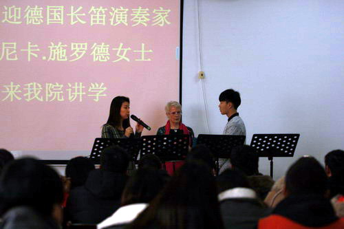 1月7日上午九点,德国音乐家团队的长笛演奏家、音乐教育家维罗尼卡·施罗德女士在厚德楼709会议室,为艺术学院师生上了一节长笛公开课,并与师生进行互动交流。德国华裔钢琴家韩卉菁亲自担任了讲课现场德语翻译。
