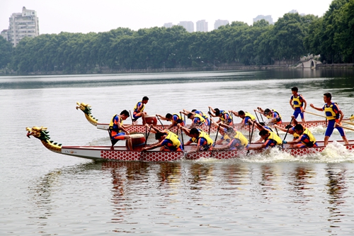 随后,两支龙舟队员们,手提木桨走上龙舟,坐在龙舟中,等待发令。在骄阳下,队员们个个英姿飒爽,精神焕发。随着甘筱青校长一声令下:我宣布庆端午龙舟表演赛,现在开划!两支龙舟,如同两支箭,在如镜的水面上,划出两条水波,队员们在鼓声中,奋力划桨,勇往直前。湖畔上,驻足观赏的人们拿着手机,纷纷拍照,记录这最精彩一瞬间,让中国传统的端午佳节多了一份喜悦和快乐。