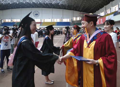 各二级学院领导和机关各部门负责人也分别走入毕业生队伍中,为全体毕业生扶正学位帽,拨转流苏。毕业生满怀激动,逐一快步趋前,向导师深深地鞠躬。整个会场气氛热烈、喜气洋洋,难忘的时刻凝聚在每个同学的笑脸上。