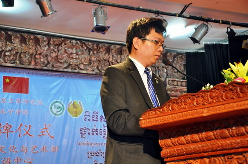 7月14日,柬埔寨王家研究院孔子学院文化与艺术部汉语中心、王家艺术大学汉语中心揭牌仪式同时在柬埔寨文化与艺术部礼堂进行。中华人民共和国驻柬埔寨特命全权大使布建国阁下、柬埔寨文化和艺术部部长彭萨格娜阁下(H.E. Pheung Sakuna)、孔子学院院长谢莫尼勒(H.E. Chea Munyrith)阁下、中方院长帅式毅及中国大使馆官员、文化部官员和孔子学院的汉语教师们出席本次揭牌活动。
