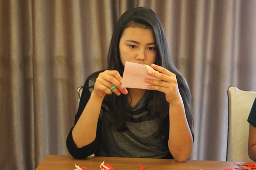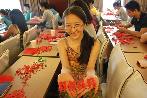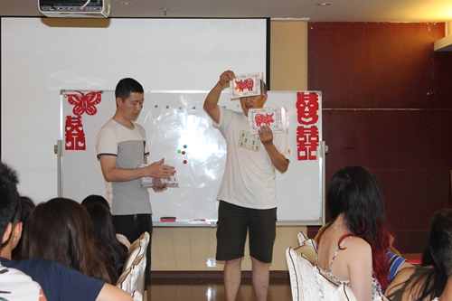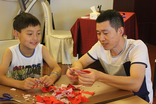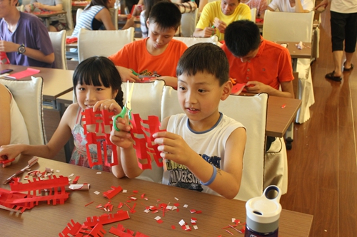 本次活动的大部分的课程对于营员们来说都是以实践为主的,剪纸当然也不例外。如今中华剪纸已经被列为世界文化遗产,作为生活在国外的华裔青少年,平时学习中接触到中国剪纸艺术的机会非常少,这堂精心安排的课程虽然时间短暂,但是内容丰富、深入浅出,将一些简单剪纸的步骤教给大家。老师从“喜”字的剪纸图入手,在讲解喜字如何被剪出来的同时,还给同学们介绍了喜字背后的文化意义。随后老师又给营员们介绍了“小人,蝴蝶,各种小动物,面具”的剪法。上课期间,老师来到营员中,亲自指导同学们如何下剪刀,如何修改剪好的作品,营员们听得如痴如醉。剪着剪着课堂上出现很多有创意的作品,如树叶、字体、小动物、DIY小人等等。在课堂结束之前,营员们都有了自己的剪纸作品,这也是他们第一次体验正宗的剪纸艺术。瑞典新星中文学校营员曾宇晨说:“剪纸是我一直都喜欢的一门中国文化艺术,以前在家就喜欢剪剪东西,但这次学习了一些简直技巧,以后就更得心应手了,我会把自己的作品带回瑞典,在我的小伙伴儿面前炫耀炫耀。”