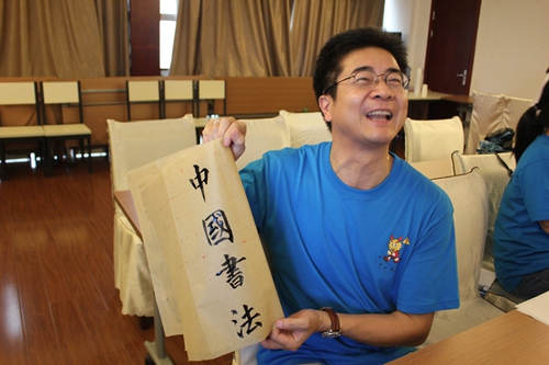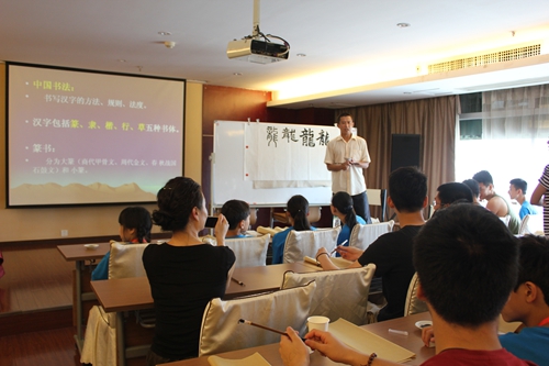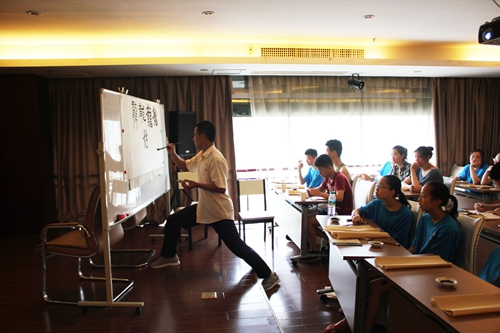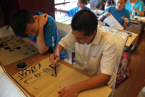 书法是贯穿中国文化的一条脉络。一堂充满浓郁墨香和风雅意韵的中国书法课程深深吸引了中国寻根之旅夏令营活动的小营员们。书法的每一个笔画,都有入笔、行笔、收笔三个过程。而且对于初学者来说,讲究平心静气,坐姿自然。在书法课上,吕卫寰老师首先从“龙”字学起,认为营员们都是“龙的传人”必须承担着发扬中国文化的使命。课上大家练习了楷体的“上善若水”,吕老师认为:“人最高的善行应该像水一样滋润万物,但不以外界阻挠而退缩。”所以中华书法必须知其意、明其德,才能用心的练好每一个字。每位营员都不断地向老师请教,并且还学习了自己的名字,一遍遍的练习,表现出对书法极大的兴趣。营员们不论是学过书法的,还是第一次学书法,都尽力完成了书法的练习。