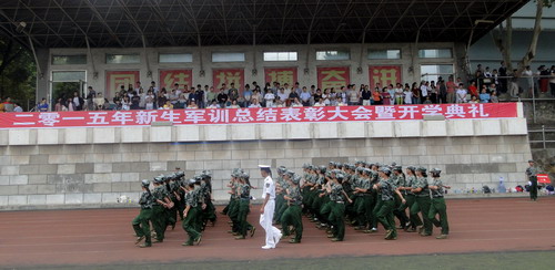 大会会场雄伟壮观,鲜艳的红旗在队前飘扬,雄壮的军歌在空中回荡。“军纪如铁,意志如钢,严格要求,勇争第一”、“激情飞扬,超越梦想、挑战极限、铸就辉煌”等大幅标语悬挂在田径运动场周围,94个排列整齐、精神抖擞的学生方队,迎着朝阳、激情满怀地等待着校领导和九江军分区首长的检阅。校领导甘筱青、吴桃娥、纪岗昌、王万山、陶春元、杨焱林,魏立平、杨耀防、九江军分区政委汪开华大校、九江军分区参谋长封志宏大校、空军场站参谋长张武中校及学校各二级学院党政负责人和有关部门负责人出席了大会。副校长王万山主持了2015级新生军训表彰大会。