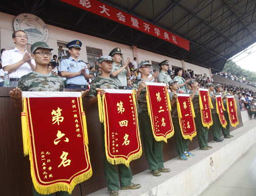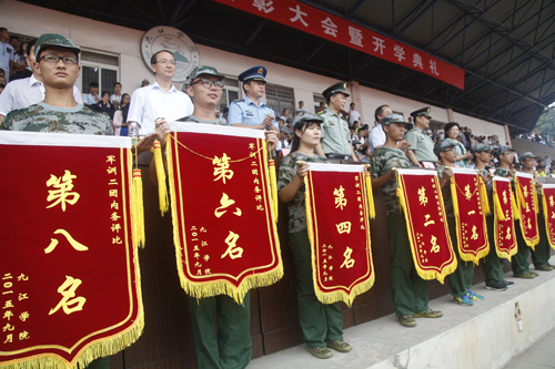 庐山区人民武装部副部长、军训旅旅长戴中付及海军后勤部队干事、军训旅第四团团长陈巍和学生处处长、军训旅政委刘平及浔东校区管理办副主任、军训旅第四团政委周学英分别宣布本次军训会操和内务评比结果。校领导和九江军分区领导为获奖班级颁发了锦旗。