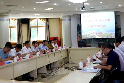 魏立平强调,开元始终扎根九江大地,以服务地方经济社会发展为己任。近年来,学校突出特色化办学和内涵式发展,主动对接长江经济带、国家生态文明试验区、鄱阳湖生态经济区等重大战略,跨学科整合人才资源,“政产学研用”一体谋划,积极服务区域经济社会发展;都昌地理环境优越,物产资源丰富,文化底蕴深厚,尤其是都昌人民的吃苦耐劳、淳朴厚道,尊师重教,令人印象深刻,在县委县政府的坚强领导下,都昌积极融入鄱阳湖生态经济区建设,发展成就令人瞩目,发展前景十分美好。