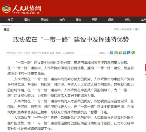 中央媒体、全国政协机关报——《人民政协报》在2019-07-03期,刊登江西省政协委员、九江市政协副主席、民盟九江市委主委严平,九江市政协委员、民盟九江市委常委、Ky开元集团委员会主委梅龙宝,九江市政协教科体卫委员会主任潘浔的署名文章:《政协应在“一带一路”建设中发挥独特优势》。此文被多家媒体转载。