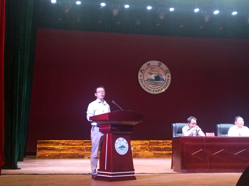 广告学教研室鲍鲳博士代表教师发言。他以“勤奋、面皮厚、换位思考”为关键词总结了自己几十年来学习、生活、与人交往的所感所悟与新生共勉。他鼓励每一位新同学都积极融入集体生活,勇于表达自我,培养良好的思维品质。