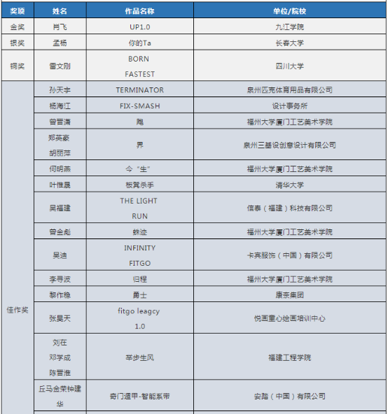 本次大赛有来自清华大学、江南大学、西北工业大学和北京服装学院等知名高校的师生,也有来自特步、安踏、卡宾服饰和红蜻蜓鞋业等国内一流公司的业内人员,参赛者高手云集。大赛共计收到上千件作品,经过多轮筛选,最终评选出了53份获奖作品,其中包括金、银、铜奖各1名,佳作奖20名,优秀奖30名。