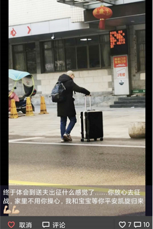 出发那天,重症医学科主治医生刘松给我们看了一条朋友圈的动态,上面是一张他拖着行李箱的背影图,那条动态这样写:终于体会到送夫出征是什么感觉了……你放心去出战,家里不用你操心,我和宝宝等待你平安凯旋。那是他的妻子在他临走时偷偷拍的一张照片。