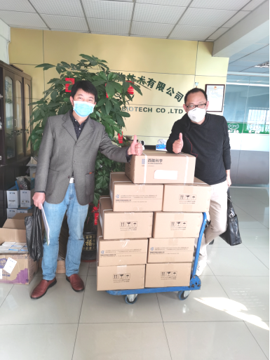 捐赠的第一批医疗防护物资(秦俊生(左)、柯长文(右))