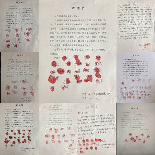 特别是医院各党支部在危急时刻、紧要关头,迅速号召党员医务工作者在抗疫前线要当先锋、做表率。全院党员踊跃报名请战,一张张按满红手印的“请战书”纷至沓来,覆盖急诊、重症、外科、内科、医技等40多个科室、部门和近千名医护人员,其中,全院各党支部300多名在职党员全部递交了“请战书”,要求加入到发热门诊和预检分诊工作,要求到全国疫情最严峻的湖北支援!用使命和担当筑起抗击疫情“第一道防线”。