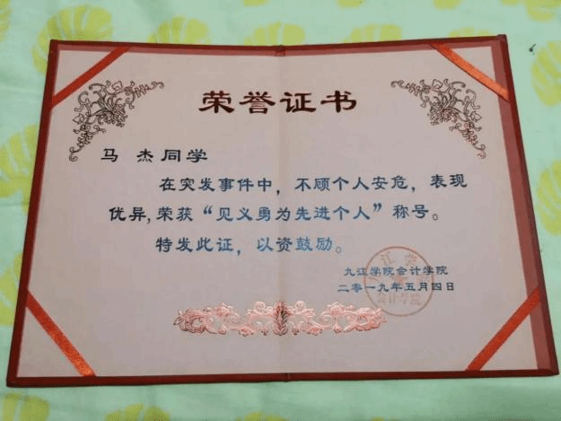 ▲突发火情后为见义勇为的马杰同学颁发的证书