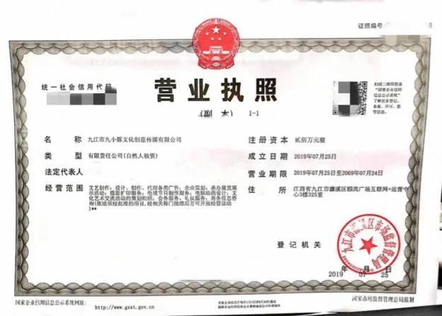 ▲创办的九小豚文化创意传媒公司营业执照