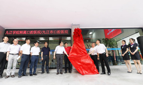 在热烈的掌声中,杨耀防、周泽甫共同为“九江市口腔医院”揭牌。