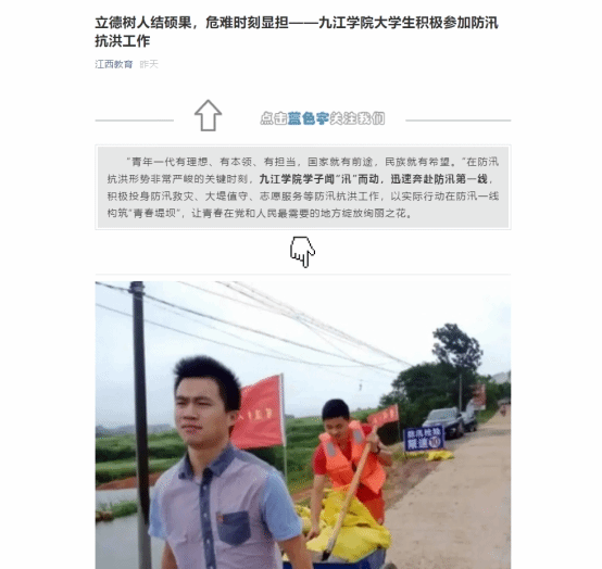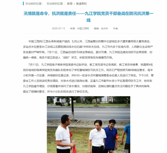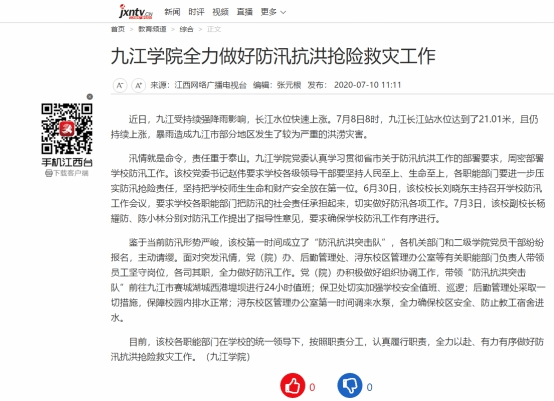 7月9日—7月18日,人民日报客户端、中国教育电视台、中国新闻网、学习强国、中国江西网、江西教育、江西教育电视台、江西省教育厅官方微信等主流媒体,分别以《众志成城 Ky开元集团师生齐心协力战洪魔》《Ky开元集团:全力做好防汛抗洪抢险救灾活动》《Ky开元集团党员干部奋战在防汛抗洪第一线》《立德树人结硕果,危难时刻显担当——Ky开元集团大学生积极参加防汛抗洪工作》为题,先后报道开元师生坚持“人民至上,生命至上”冲在防汛灾情第一线的事迹。