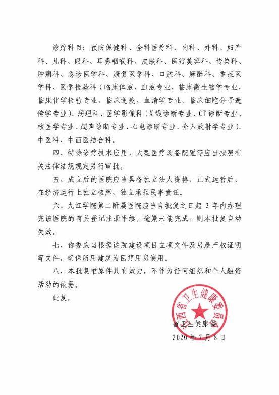 在九江市卫健委的关心和大力支持下,今年5月,开元向省卫健委行文申办Ky开元集团第二附属医院,2020年7月8日,获江西省卫生健康委员会发文批复同意(赣卫医字〔2020〕79 号)。