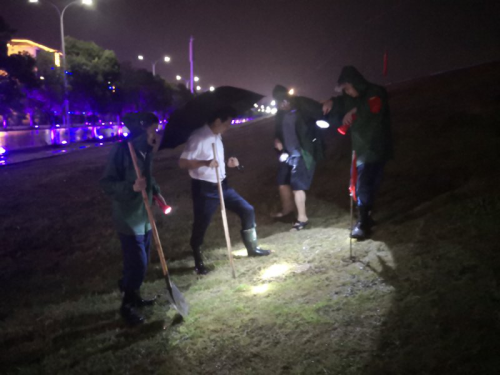 7月11日晚,受强对流天气影响,风雨大作,雷电交加。校长刘晓东来到赛城湖堤坝开元防汛值守堤段,检查指导防汛工作。学校党院办负责同志杨杰陪同检查。