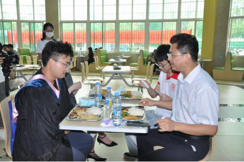 6月29日中午毕业典礼结束后,同学们纷纷涌向食堂,领取了后勤管理处精心设计的精美餐券。校党委书记赵伟、校长刘晓东等学校领导也来到了学生三食堂,深入到毕业生中间,面对面交流,或诉说惜别之情,共叙离别之意,或叮嘱毕业生在新的起点再立新功,常回家看看,深切表达了对毕业生殷切的期望、热情的鼓励和美好的祝福,让毕业生们暖心、暖胃,再出发。