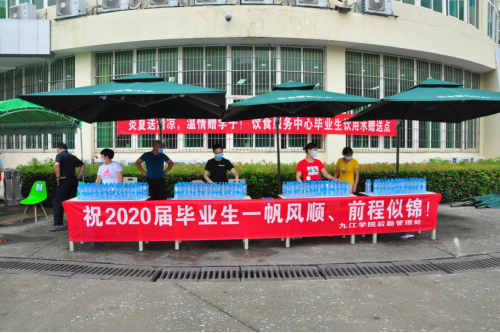 不少毕业学子在食堂久久不舍离去,他们说:“这顿饭意义不一样,所以觉得特别好吃,感谢食堂特别有心、有情的安排”。据后勤管理处介绍,为使得毕业餐活动现场既气氛热烈又井然有序,后勤处饮食服务中心全员出动,提前三天备足食材,调整员工休息时间,从餐具到食品打包袋,处处都细心安排。为了不让不在饭点出发的毕业生不至于饿肚子,饮食服务中心上午十点就开始了打包工作,让孩子们带着盒饭上车。在学子们登车离校前,饮服中心还为每一位毕业生准备了免费的矿泉水。九院后勤人正是按照“管理育人,服务育人,环境育人”的宗旨和要求,精心准备、暖心服务的,他们用实际行动为2020届毕业学子们最后一次当好了“不上讲台的教师”角色。