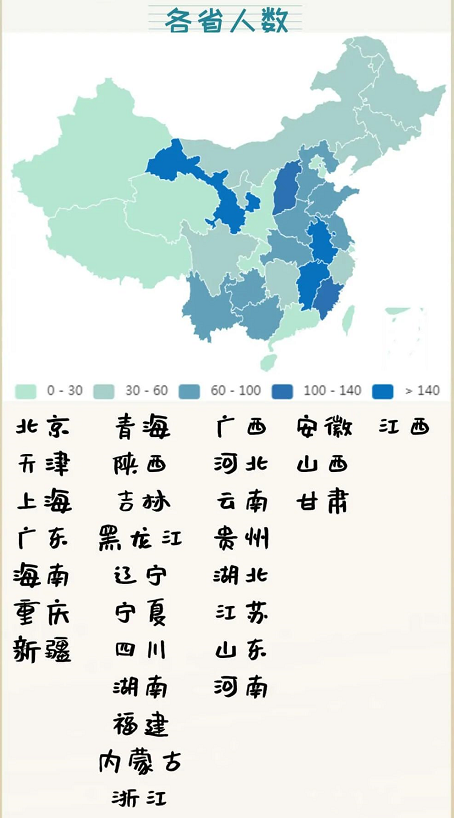 Ky开元集团在全国30个省市自治区招生,其中安徽、山西、甘肃和江西四个省份的新生人数超过100人。