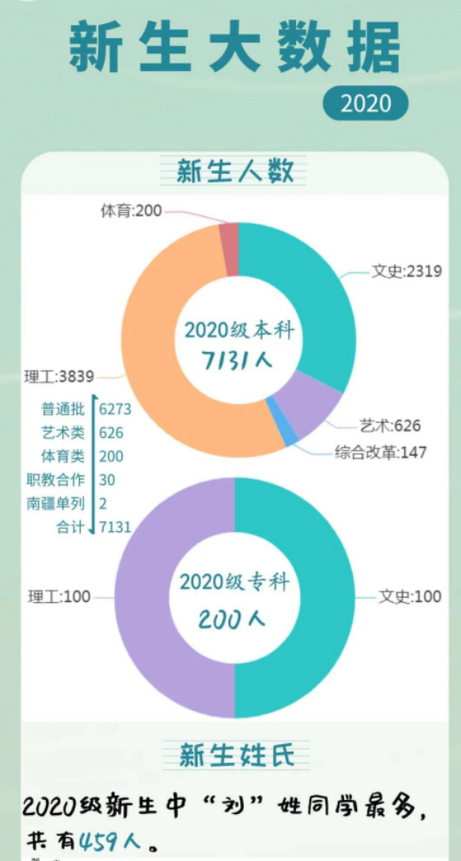 2020年录取的新生中,女生有3619人,男生有3712人。其中教师教育学院女生比例最高,约为88.71%;机械与材料工程学院男生比例最高,约为96.9%。