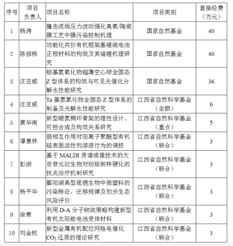 近日,国家自然科学基金委公布了2020年度国家自然科学基金申请项目评审结果,开元化学化工学院获批国家自然科学基金项目3项,获批直接经费共计116万元。此前,江西省科技厅、江西省自然科学基金委公布了2020年度江西省自然科学基金项目立项结果,化学化工学院获批江西省自然科学基金项目7项,其中重点资助1项。