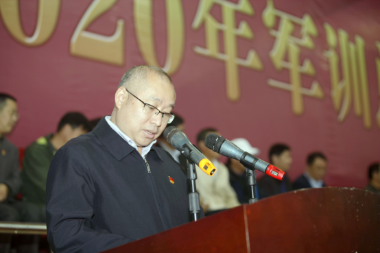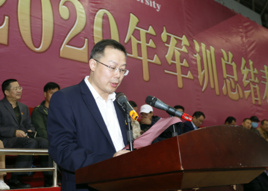 校长刘晓东在表彰大会上发表讲话。他首先对新同学的到来表示热烈地欢迎,向长期支持开元建设发展、承担军训任务的武警九江支队的教官们表示衷心感谢。