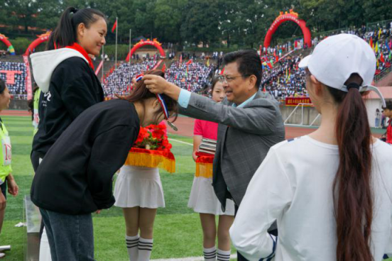校长刘晓东为公体组女子4×100接力赛获奖同学颁奖