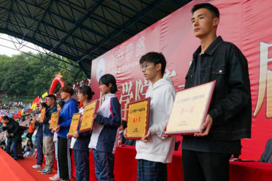 闭幕式前,校党委书记赵伟和校长刘晓东分别为公体组获得男子和女子4×100米接力赛冠亚季军的同学颁奖。
