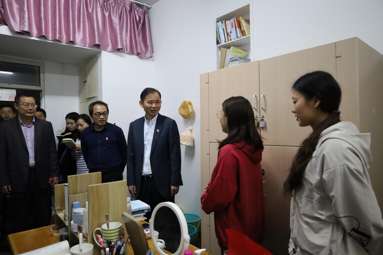 在学生宿舍3号楼,赵伟与文传学院汉语言文学专业A1822班107寝室的同学们亲切交谈,细心询问她们的生活情况,叮嘱同学们要安全用电,务必把寝室安全放在第一位,注意寝室的环境卫生,创造一个干净整洁的学习、生活空间。