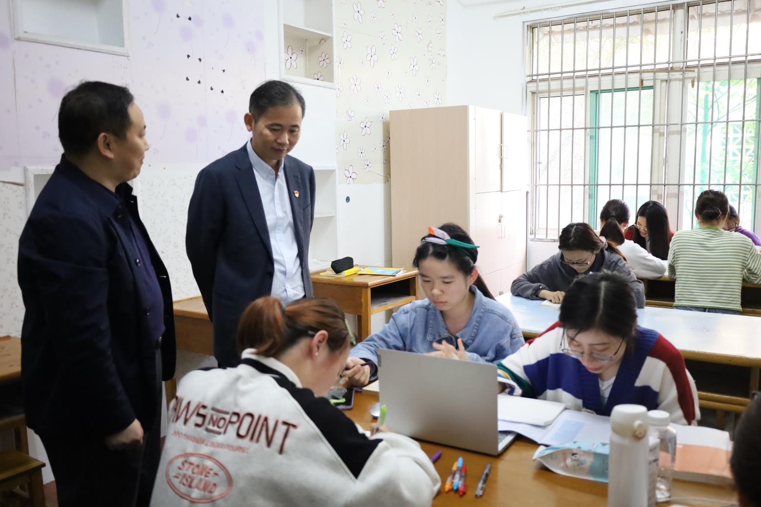 赵伟还参观了设在109寝室的考研自习室,看望正在紧张准备考研复习的同学,勉励他们刻苦学习,顽强拼搏,同时要注意劳逸结合,加强锻炼。他指出,文传学院在宿舍楼栋中开辟考研自习室,给考研的同学创造良好学习条件,既是关心关爱学生的具体体现,也是加强学风建设的重要举措,值得肯定和表扬。
