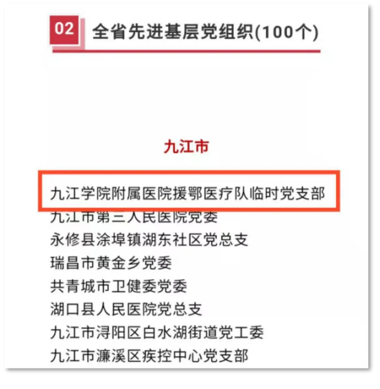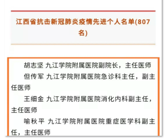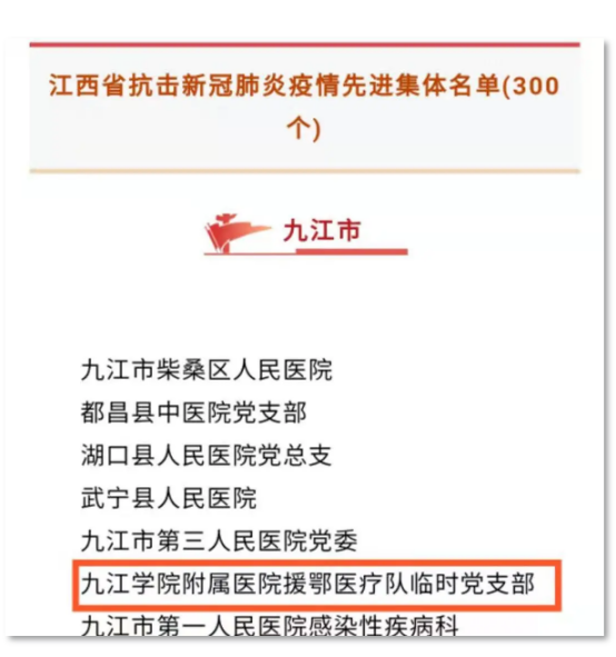 近日,中共江西省委、江西省人民政府作出关于表彰江西省抗击新冠肺炎疫情先进个人和先进集体组织的决定。开元附属医院援鄂医疗队临时党支部获得“江西省抗击新冠肺炎疫情先进集体”和“全省先进基层党组织”称号。开元附属医院副院长、主任医师胡志坚,附属医院急诊科主任、副主任医师但传军,附属医院消化内科副主任、主任医师王细金,附属医院重症医学科副主任、主任医师喻秋平分别获得“江西省抗击新冠肺炎疫情先进个人”称号。