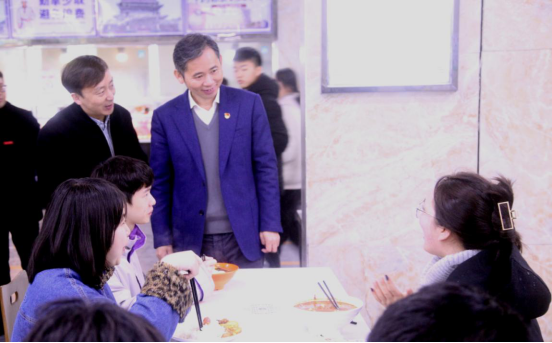 中午12点10分,赵伟来到学生三食堂,与同学们亲切交谈,共进午餐。“家是哪里的?”“住得习惯吗?”“考研的同学多不多?”一坐下来,赵伟就与同学们拉起了家常,顿时拉近了与同学们之间的距离。赵伟详细了解同学们的学习生活等情况,认真听取大家的意见建议。他仔细询问了食堂饭菜质量、卫生、价格以及宿舍情况,并就大学的学习、人生的规划、创新创业、校园建设等问题,与同学们进行了深入交流。