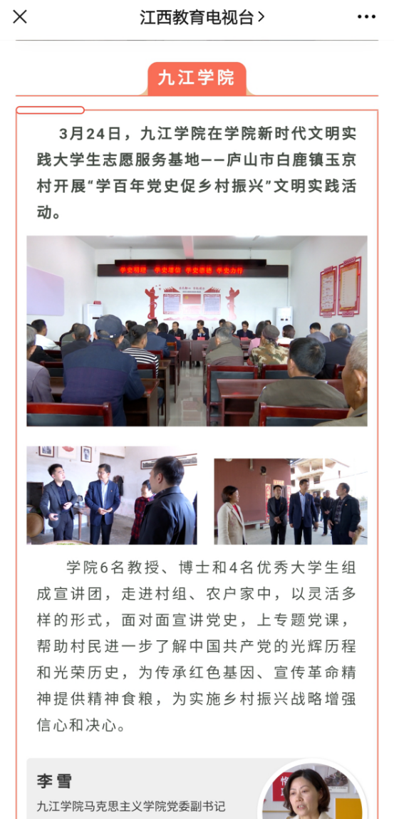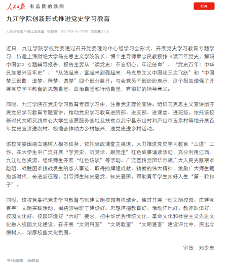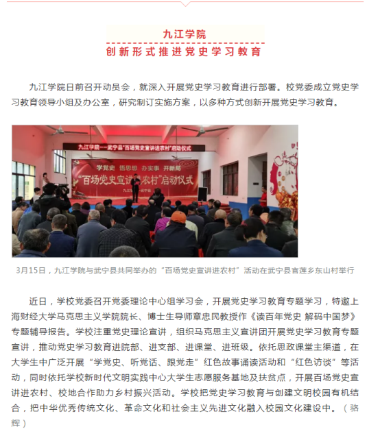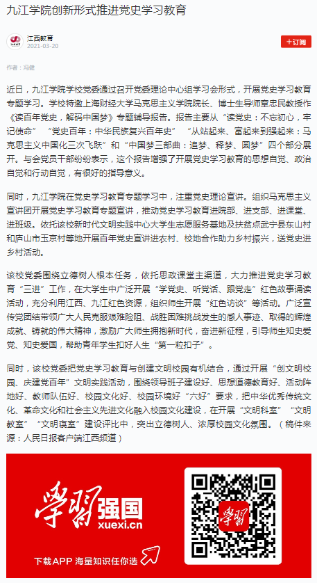 近日以来,学校党史学习教育受到中央及省市主要媒体广泛关注。截至目前,学习强国、人民日报客户端、新华社客户端、中国新闻网、江西省委党史教育专题网站、江西教育电视台、中国江西网、江西日报、江西教育网、九江广播电视台等媒体40余篇稿件报道了开元党史学习教育,引发校内外热烈反响,为党史学习教育的深入开展营造了良好的舆论氛围。