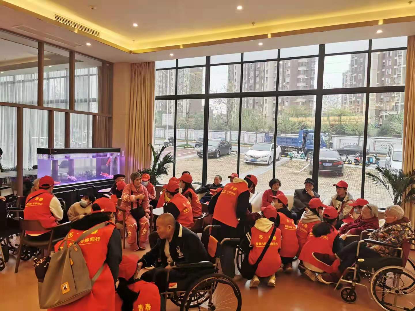 活动中,青年大学生志愿者为老人们唱红歌、演小品、诗朗诵,和老人拉家常,帮老人打扫房间、整理衣物,老人们看得入迷,听得用心,笑得开心。