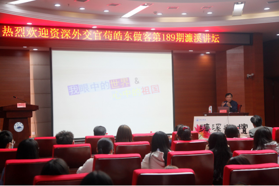 苟皓东先生先后在澳大利亚、伊朗、厄立特里亚、利比里亚、博茨瓦纳、坦桑尼亚的中国大使馆工作,时间长达二十多年,游历过亚太、中东、欧洲、非洲和美洲等40多个国家,曾担任中国驻非盟使团副代表、驻印度尼西亚登巴萨总领事等职务,拥有丰富的海外经历、外交智慧和广阔的世界眼光。讲座中,他通过一张张有故事的图片与师生们分享了他长期在世界各地工作、游历和研学的亲身经历和所见所思,与大家分享了他眼中的世界和心中的祖国。