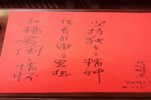 讲座结束后,苟皓东先生为濂溪讲坛题辞:“坚持独立之精神,培育自由之思想,弘扬爱国之情怀”。