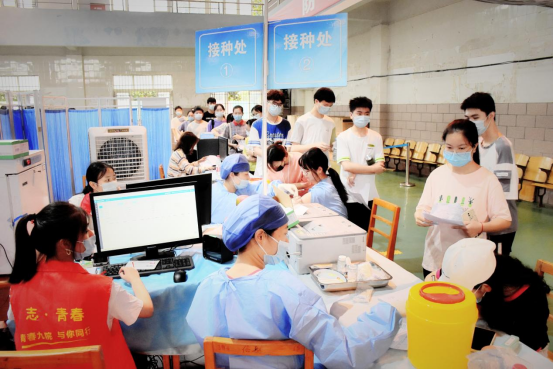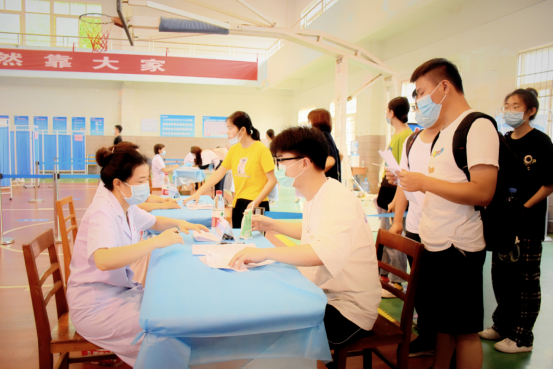 在长达一个多月的疫苗接种过程中,第一针接种2万7千余人,第二针接种2万5千人左右。学校为参加接种的师生提供了全方位、全流程的贴心服务,从排队引导、扫码测温、填表咨询、信息录入、疫苗接种、留观服务等各个环节,都充满了人文关怀。接种期间场馆内温度不断破历史新高,校领导考虑受种人员、工作人员的身体健康,提前在等候区、留观区放置桶装水和一次性水杯,给工作人员免费发放防中暑药品,每个环节都安排了工作人员,确保接种协调顺畅、安全有序。
