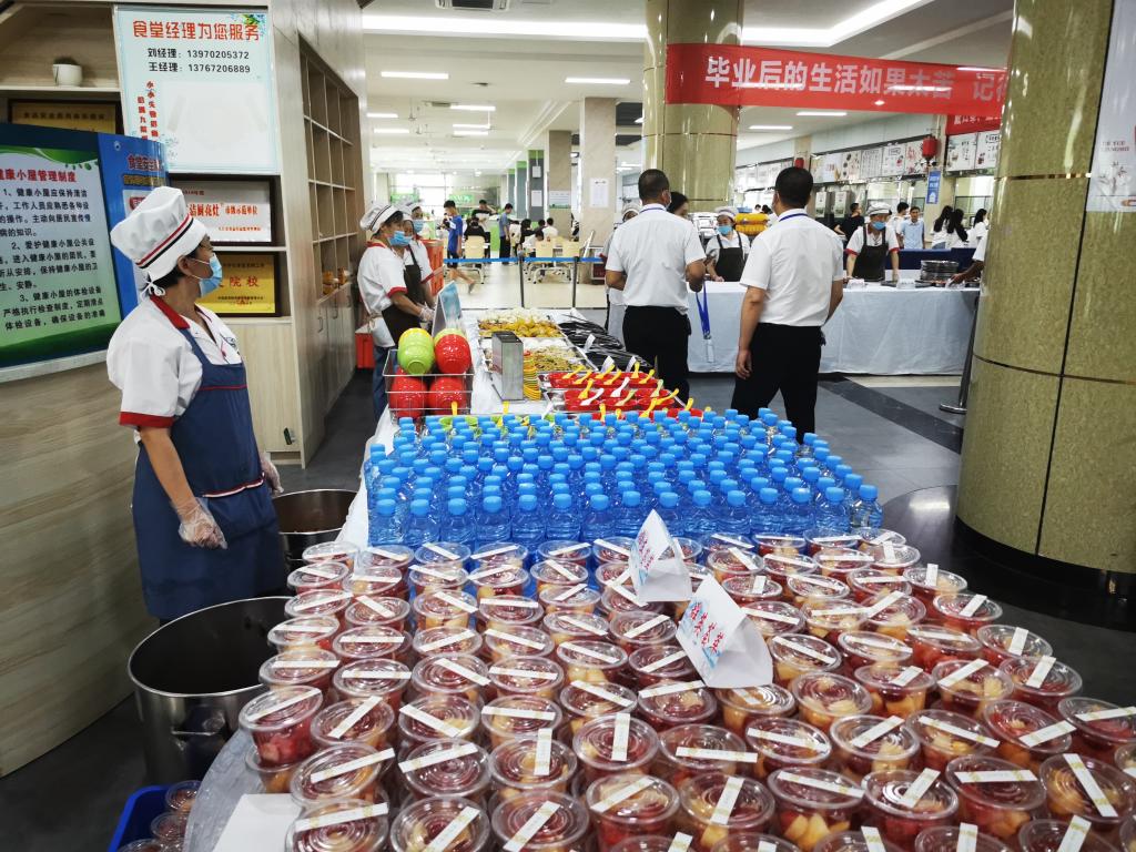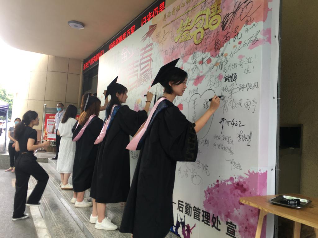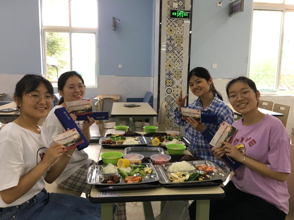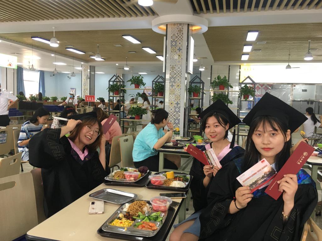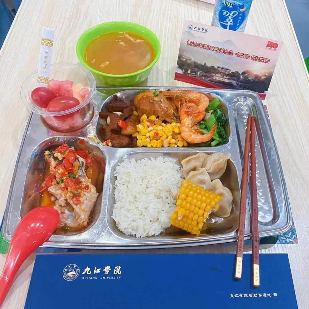 “再刷几次校园卡吧,以后就要用校友卡啦”、“毕业后的生活如果太苦,记得回母校加点糖”、“岁月如歌珍惜师生缘,来日似锦不忘九院情”,学生食堂一条条催泪的横幅,让毕业生们更加眷恋九院食堂的“美食美刻”。中午11点后,毕业生们陆续来到学生一、三食堂和浔东校区食堂。琳琅满目的菜肴已经摆满了餐台,鸿运满途(红烧肉)、青葱岁月(小葱豆腐)、片片情深(九江鱼片)、红红火火(白灼基围虾)等一道道充满寓意的菜肴,让学生们赞美又回味。同学们深情地举起大拇指为有情有味的九院点赞。