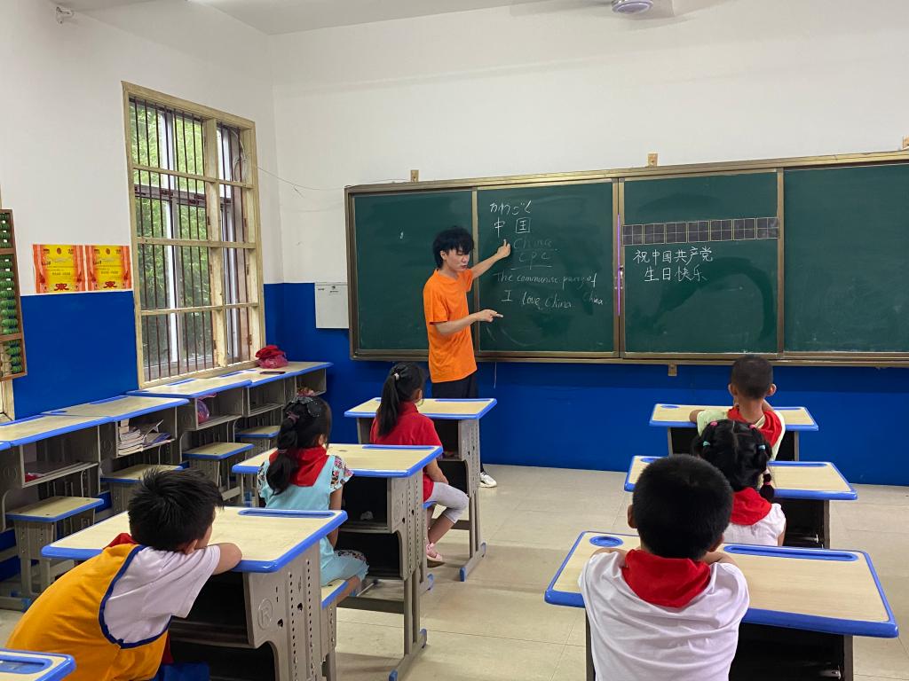 7月3日下午,外国语学院服务队结合自身专业,在东山小学为同学们呈现了一堂别开生面的多语种“思政课”。他们将简单的英语、日语穿插进党史小故事中,让孩子们既接受了党史教育,又掌握了基础的多语种语言词汇。队员们教会孩子们用标准的英语说“我爱你,中国”、“我爱中国共产党”,教室边上围观的群众们也一起大声跟读。此时此刻,浓浓的爱国热情充满了东山小学教室。