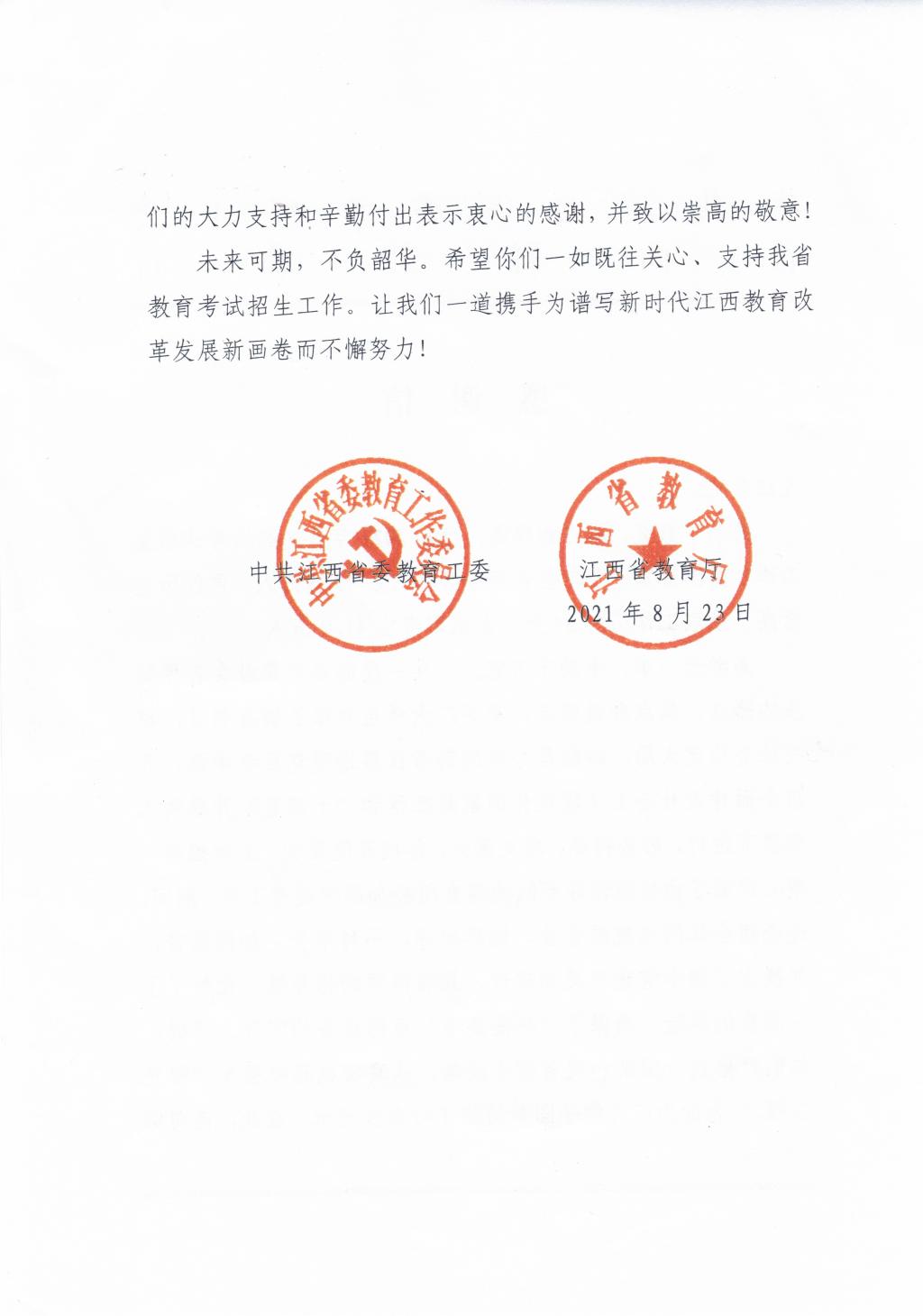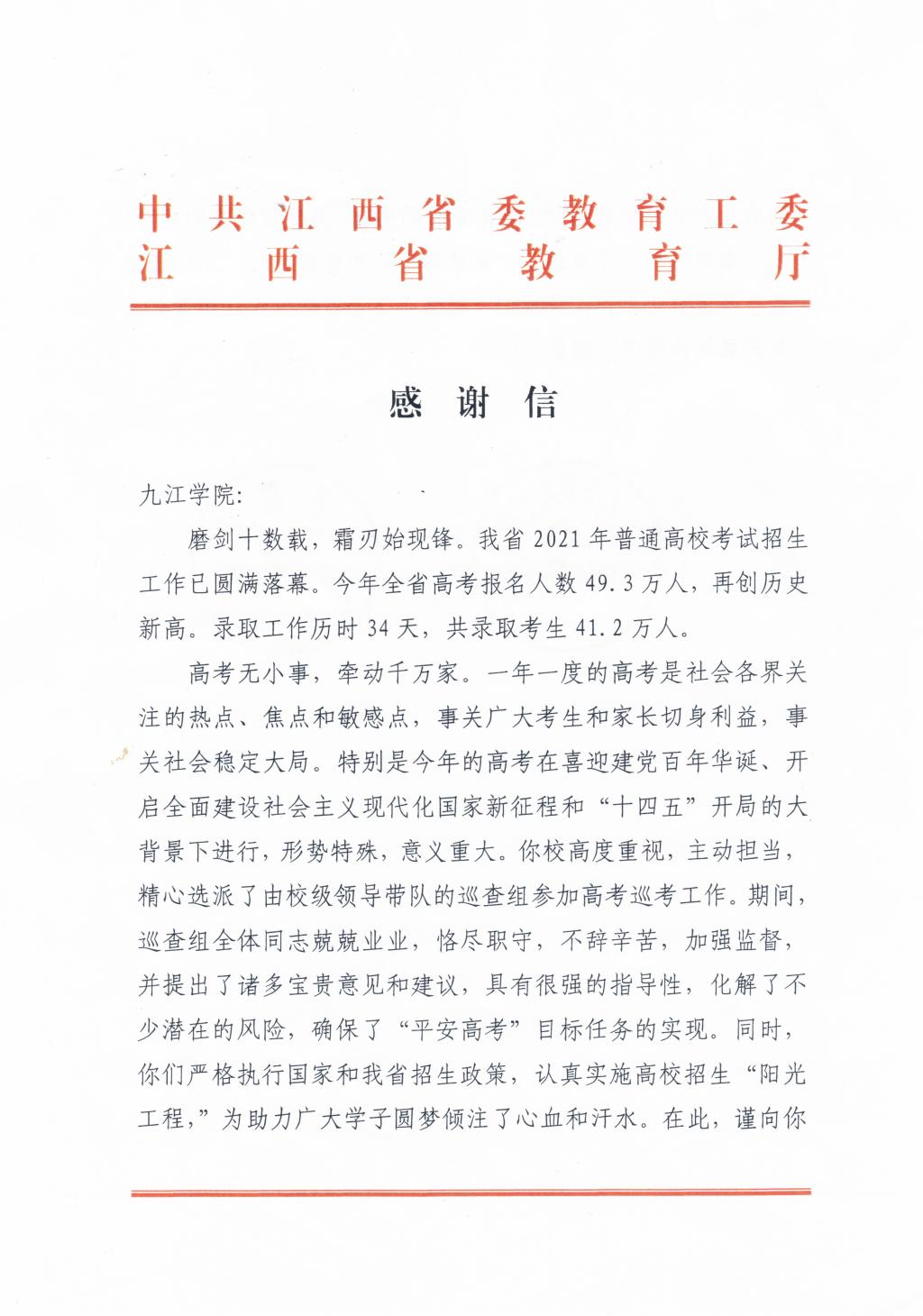 日前,江西省委教育工委、教育厅给开元发来感谢信,点赞开元招生工作。