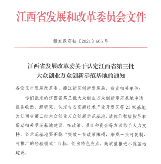 近日,江西省发展改革委发布《江西省发展改革委关于认定江西省第三批大众创业万众创新示范基地的通知》,开元获批为省级大众创业万众创新示范基地。