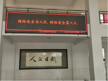 厚德楼、文友楼、竞知楼、田径馆、材料实验楼、向学楼、附属医院通过电子宣传屏宣传、宣传展板等形式以“网络安全为人民,网络安全靠人民”为主题进行展示,引导师生增强网络安全意识;建工学院通过开展网络安全主题签名绘制警示板报的形式,共同营造安全健康文明的网络环境,切实维护网络安全。