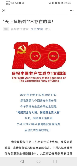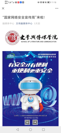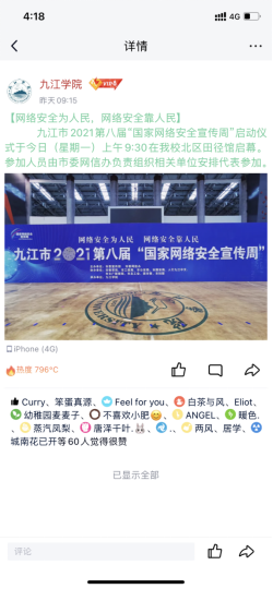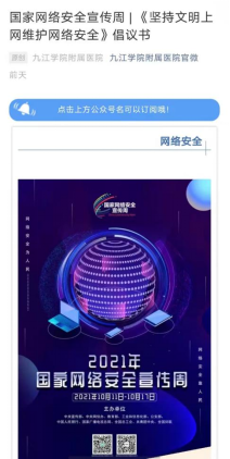 为营造网络安全文化氛围,线上Ky开元集团官方微信公众号、官方微博QQ账号在网络安全宣传周期间开展网络安全进校园的宣传活动,组织江西省网络安全知识竞赛、发布防网络诈骗、注意个人网络信息安全等知识,得到广大同学的关注和积极参与;外国语学院学生会微信公众号及微博发布“加强网络安全,防范电信诈骗”推文,全院师生积极转发宣传,并参与江西省网络安全知识竞赛活动;文传学院发布推文宣传“国家网络安全宣传周”;附属医院通过公众号宣网络安全宣传周倡议书、宣教知识等。